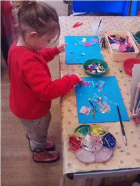 Lots of creativity was seen in the craft and building areas using paints, black gloop, Lego, mosaic shapes and glitter. Volcanoes are still an interest to some of the children who were intrigued by the volcanic rock that a teacher brought in; subsequently this led onto finding out how the rock came to the surface.