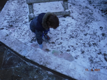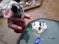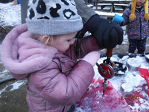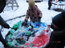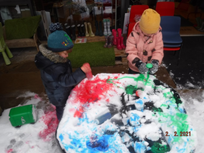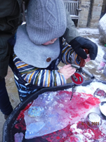 Colour filled pipettes and squeezey bottles made beautiful patterns in the medium that nature had provided and of course we couldn't pass up the chance of making a snowman.